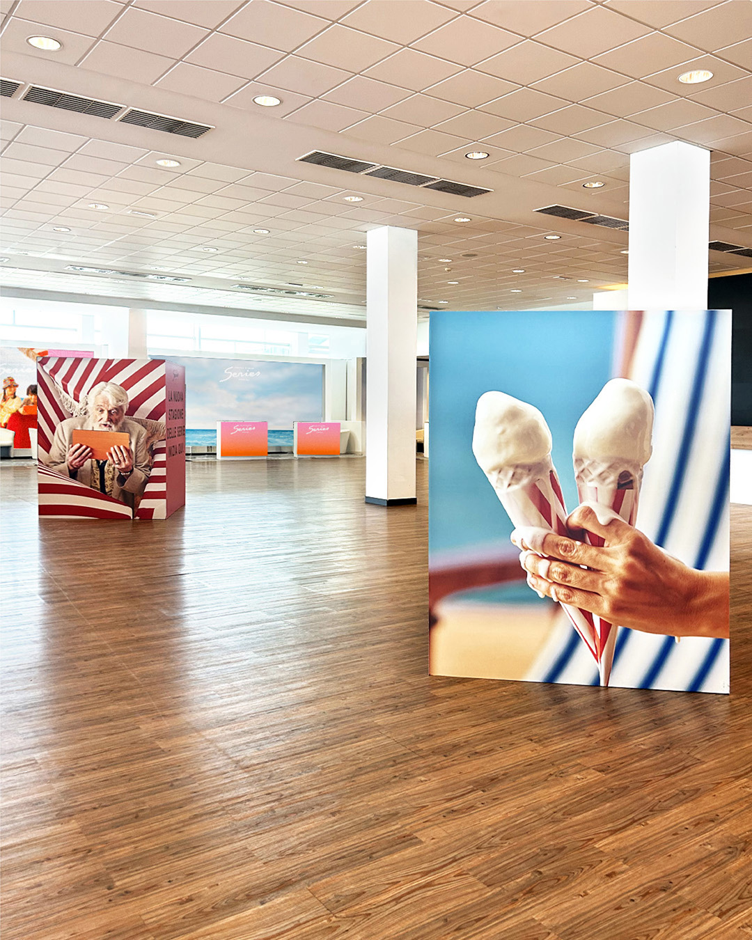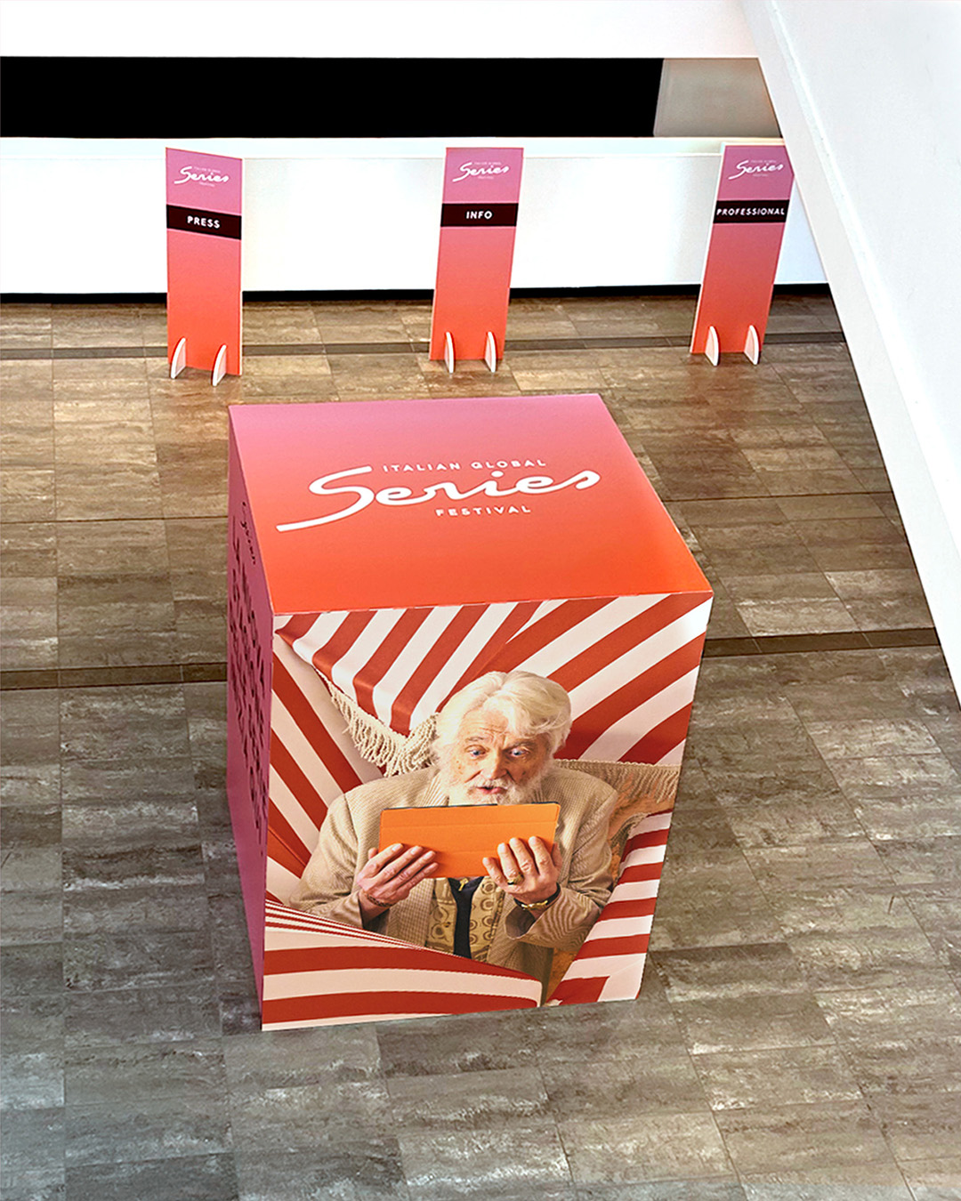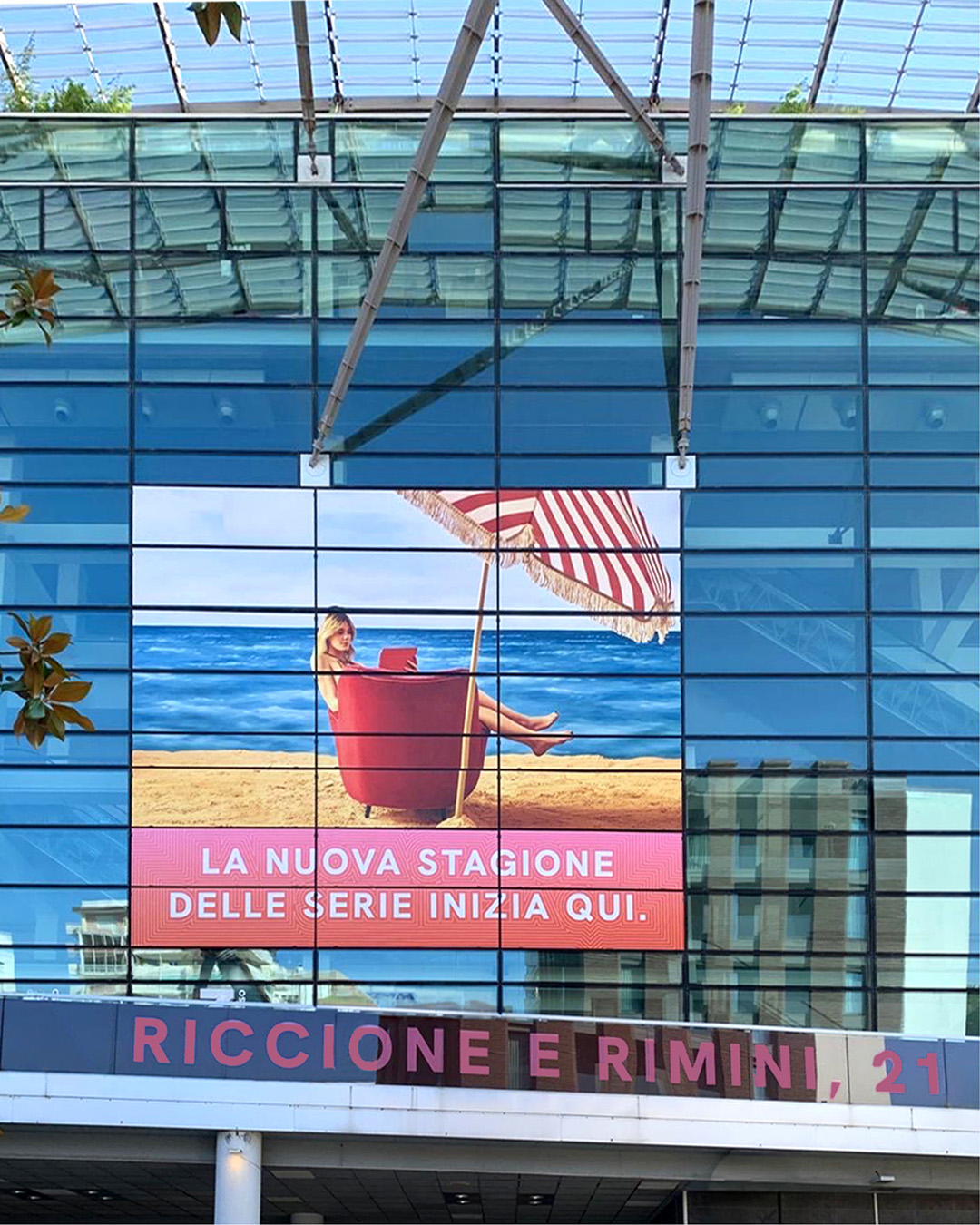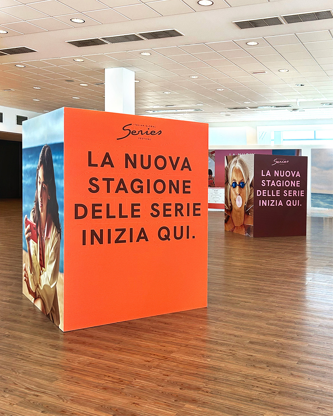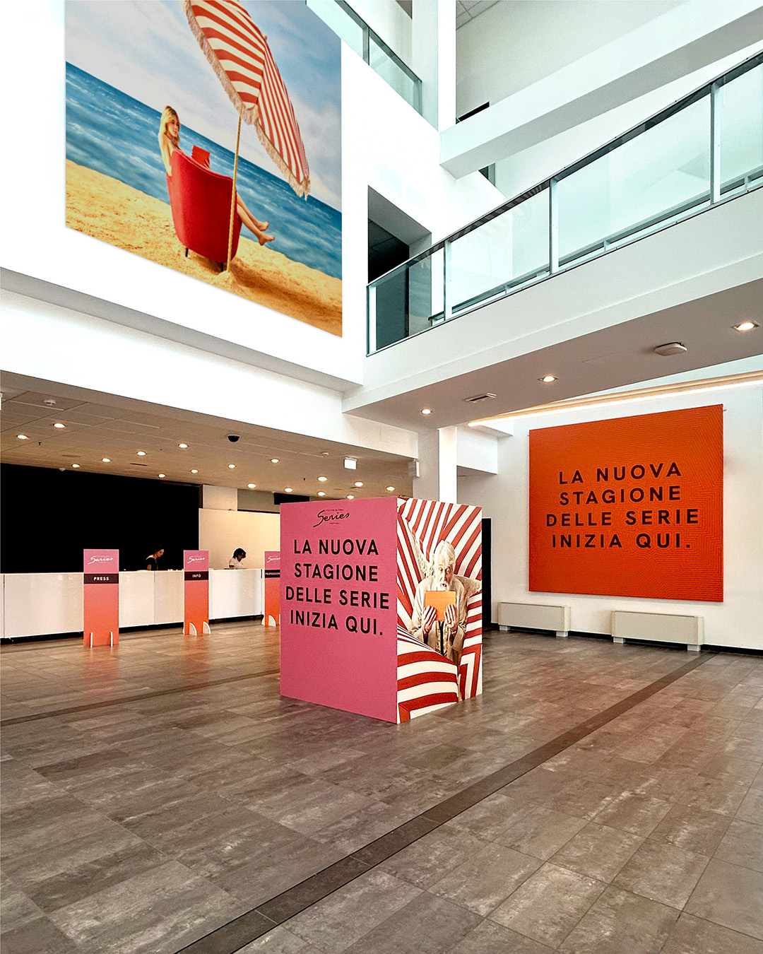 The campaign is rooted in the iconic locations of the Romagna Riviera: Riccione and Rimini, the birthplace of Federico Fellini. It is a festival with a vintage, glamorous vibe where you can relax by the sea and enjoy an exciting series that transports you away from your surroundings and keeps you glued to the screen, as if you were sitting in an armchair at home or in a movie theater. We translated this same imagery into a site-specific installation and applied it to signage for all the festival locations. The visual identity reflects the series’ rhythm and ability to capture the present: fluid, recognizable, and in motion.