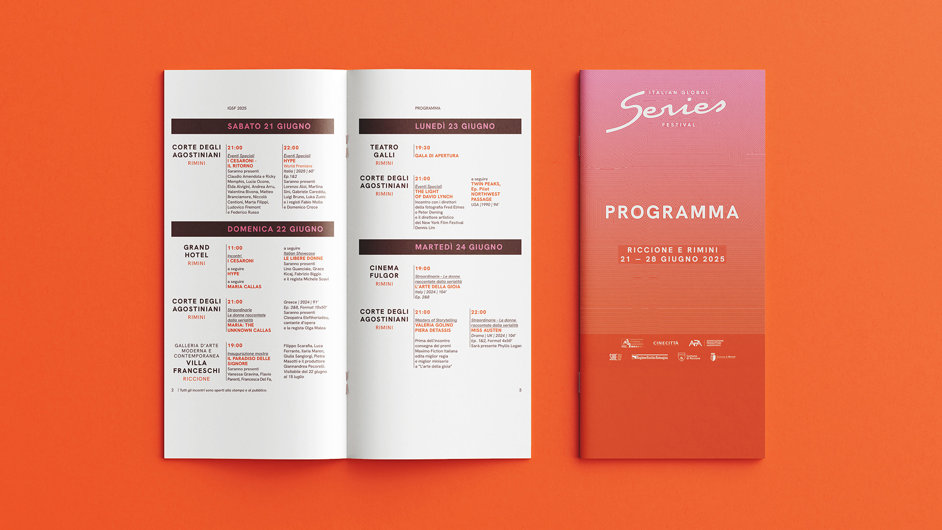 The base type for the logo is Felliniana, chosen as a tribute to the great film director, Federico Fellini. We paired Felliniana type with a color palette featuring vibrant, glamorous shades that contrast sharply with the azure sea and sky along the coast of Riccione and Rimini, where the first edition took place. The combination of orange and pink creates a vibrant hue that serves as the backdrop for various applications. We started with the concept of seriality, which we visualized through two formats. The first is linked to color bands and alternating blocks of color, and the second is a system of lines that trace the subject’s outline and expand it serially into space. Using the Dynamic brand methodology, we designed every element of the identity – from the website to communication across various touchpoints – to adapt to the context, maintain consistency, and generate meaningful connections.